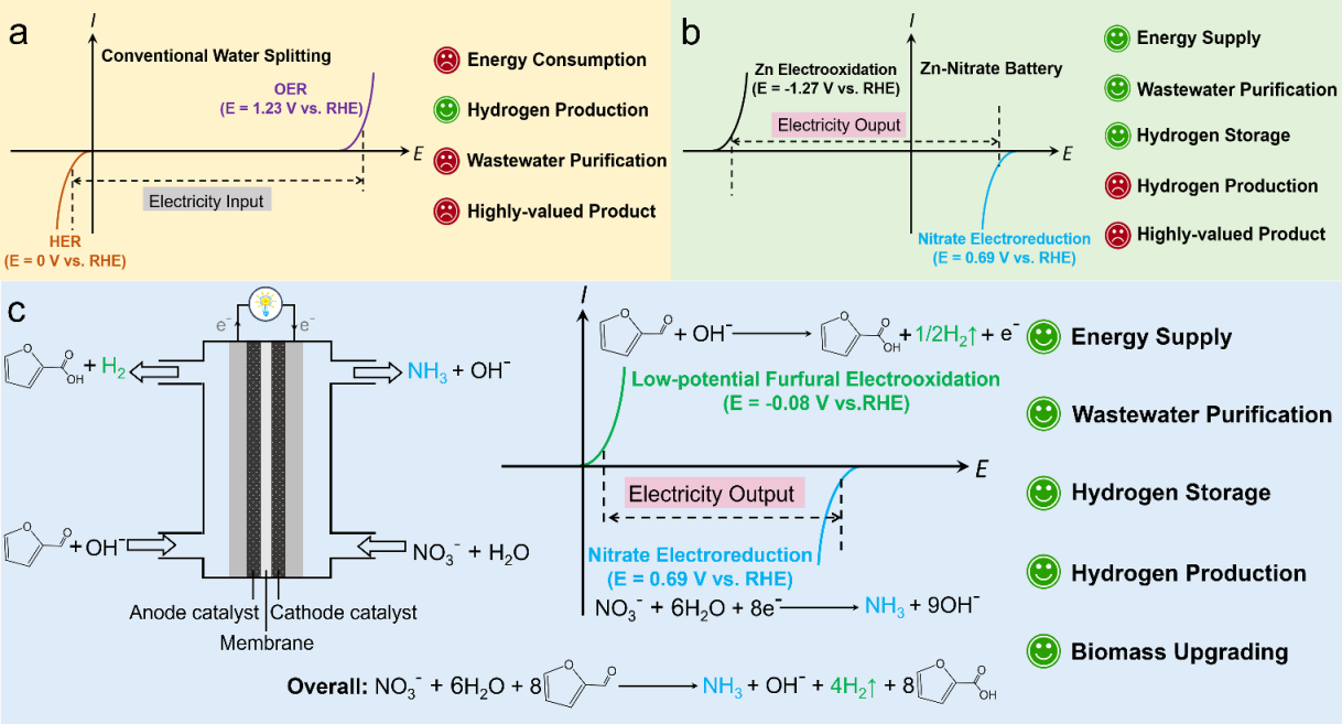 随着全球矿物能源逐渐枯竭和环境问题日益严峻,绿氢(绿氨)能源获取和废弃物清洁转化利用技术受到世界各国的高度重视。全球工业化和农业化进程中产生了大量硝酸盐和醛类(如糠醛、甲醛)废弃物及污染物,对人类健康和生态系统构成重大危害。由于当前净化技术存在能耗高、耗时久、成本显著等问题,其应用仍面临巨大挑战。