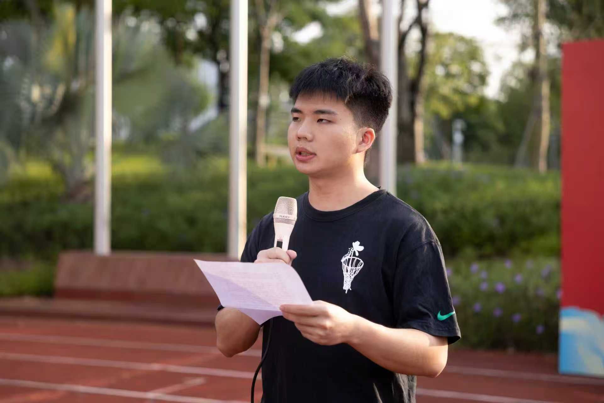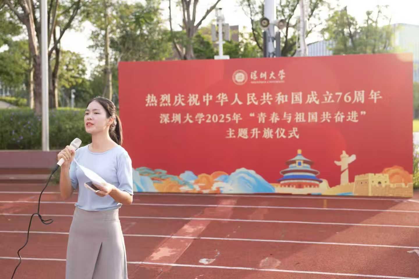 学生代表、本科生党支部党员陈智同学在国旗下发言。他首先向新中国76载华诞致敬:80年前,中国人民以血肉之躯赢得抗日战争暨世界反法西斯战争伟大胜利;76年前,天安门城楼上的庄严宣告掀开民族复兴新纪元。改革开放以来,深圳经济特区拔地而起,深大与特区共奋进。结合专业特色,他阐释了“材料强国”的使命,号召同学们要将热爱化为攻关动力,以“材料强则制造强,制造强则中国强”的信念砥砺前行,用青春和科研托举民族复兴。