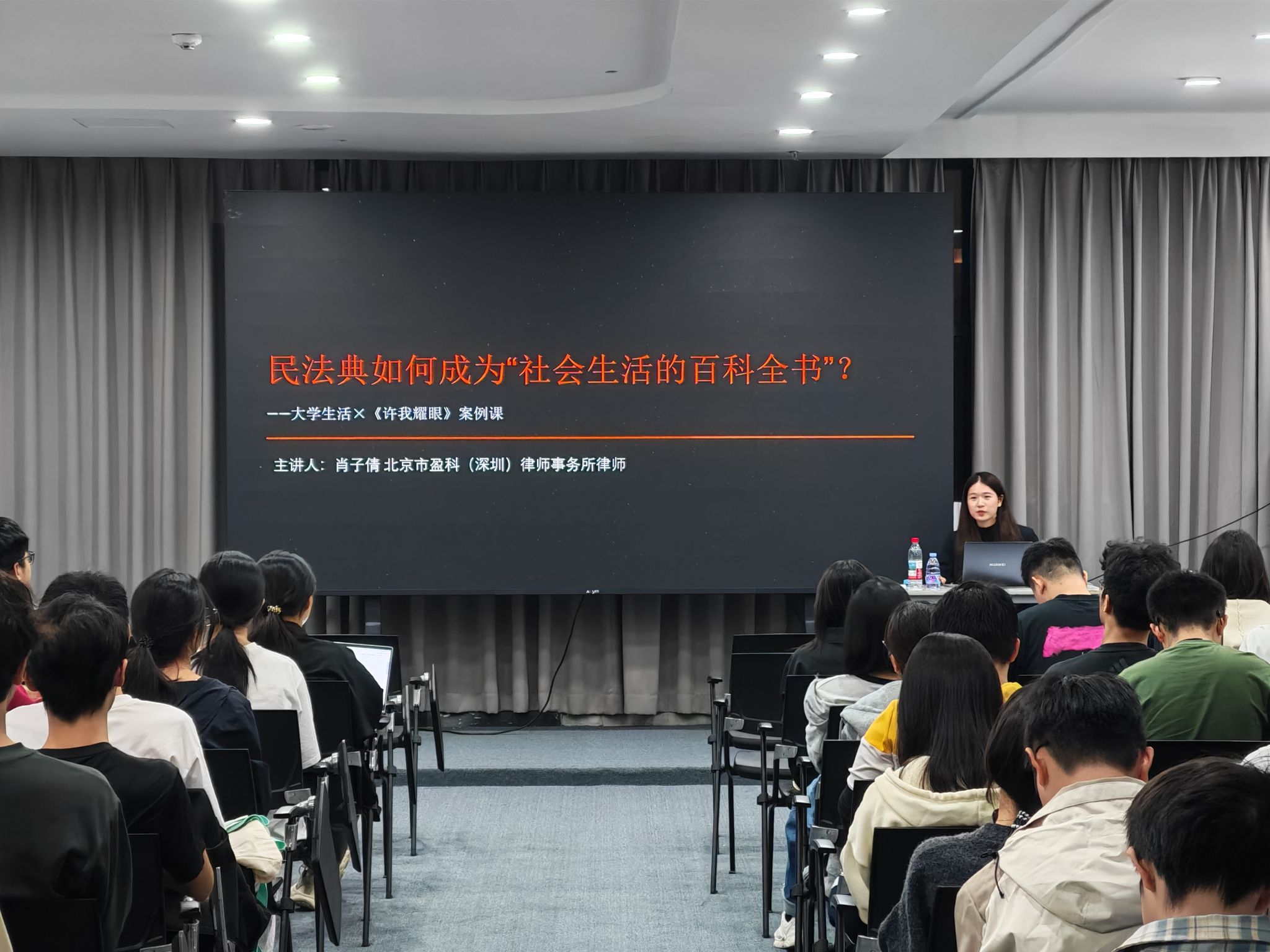 联合惟品社区在胡杨林214活动室举办普法讲座,特邀2020届深大法学院毕业生肖子倩律师主讲,为100余名学子带来“民法典如何成为‘社会生活的百科全书’——大学生活×《许我耀眼》案例课”,以鲜活场景、通俗表达,为同学送上专属法律“护航指南”。