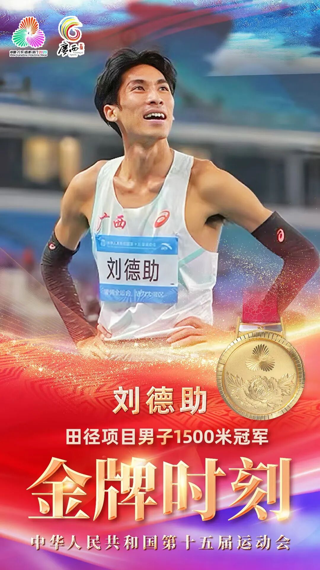 11月20日,在刚刚结束的第十五届全国运动会田径项目男子1500米决赛中,广西运动员刘德助突破重围、锐不可当,勇夺冠军,为广西体育代表团斩获本届全运会第十枚金牌!